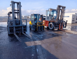 ③フォークリフト写真 ④ヤード構内写真 写真の3台でコンテナ積み込み等の作業を行っています (左から5t、2.5t、12.5tのフォークリフト)