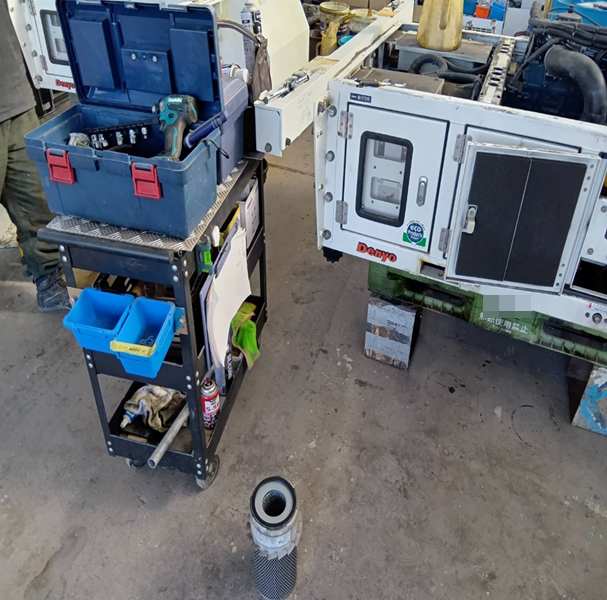 今回は、北海道で特に使用頻度の高い発電機(MG)についてご紹介いたします。 発電機(Motor Generator)は、リーファーコンテナの冷凍機へ電力を供給し、安定稼働させるための機材です。 北海道では、コンテナをシャーシに積載して輸送するケースが多く、発電機は欠かせない設備となっています。 弊社では、お客様に安心してご使用いただけるよう、年1回の定期点検を実施しております。 ①~③の画像は、定期点検中の発電機(アンダーマウントタイプ)です。 ① アンダーマウントタイプ(コンテナシャーシの下部に装着します)② 発電機のカバーを外して点検作業を行います(エアフィルター交換作業の様子)